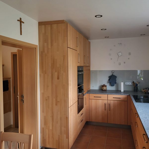 Nachdem ich lange nach einer neuen Küche gesucht habe, habe ich nun meine Traumküche gefunden. Schon beim ersten Besuch der Firma Henche-Möbelwerkstätte habe ich in der Ausstellung genau die Front (Buche massiv) für meine neue Küche gefunden, nach der ich schon sehr lange gesucht hatte. Die Beratung durch Frau Henche war sehr gut und professionell. Sie hat mir viele gute praktische Anregungen zur Ausführung gegeben. Die Planung wurde entsprechend meiner Wünsche angepasst und man war auch noch sehr flexibel, als ich mich kurzfristig umentschieden habe, die Spüle und das Kochfeld bündig mit der Arbeitsplatte aus Naturstein einzubauen. Der Aufbau der Möbel erfolgte zuverlässig genau nach Terminabsprache. Auftretende kleine Probleme wurden einvernehmlich und gut gemeinsam zu meiner Zufriedenheit gelöst. Die Qualität der Möbel ist super und mein Mann und ich freuen uns täglich, wenn wir in der Küche sitzen oder dort kochen.